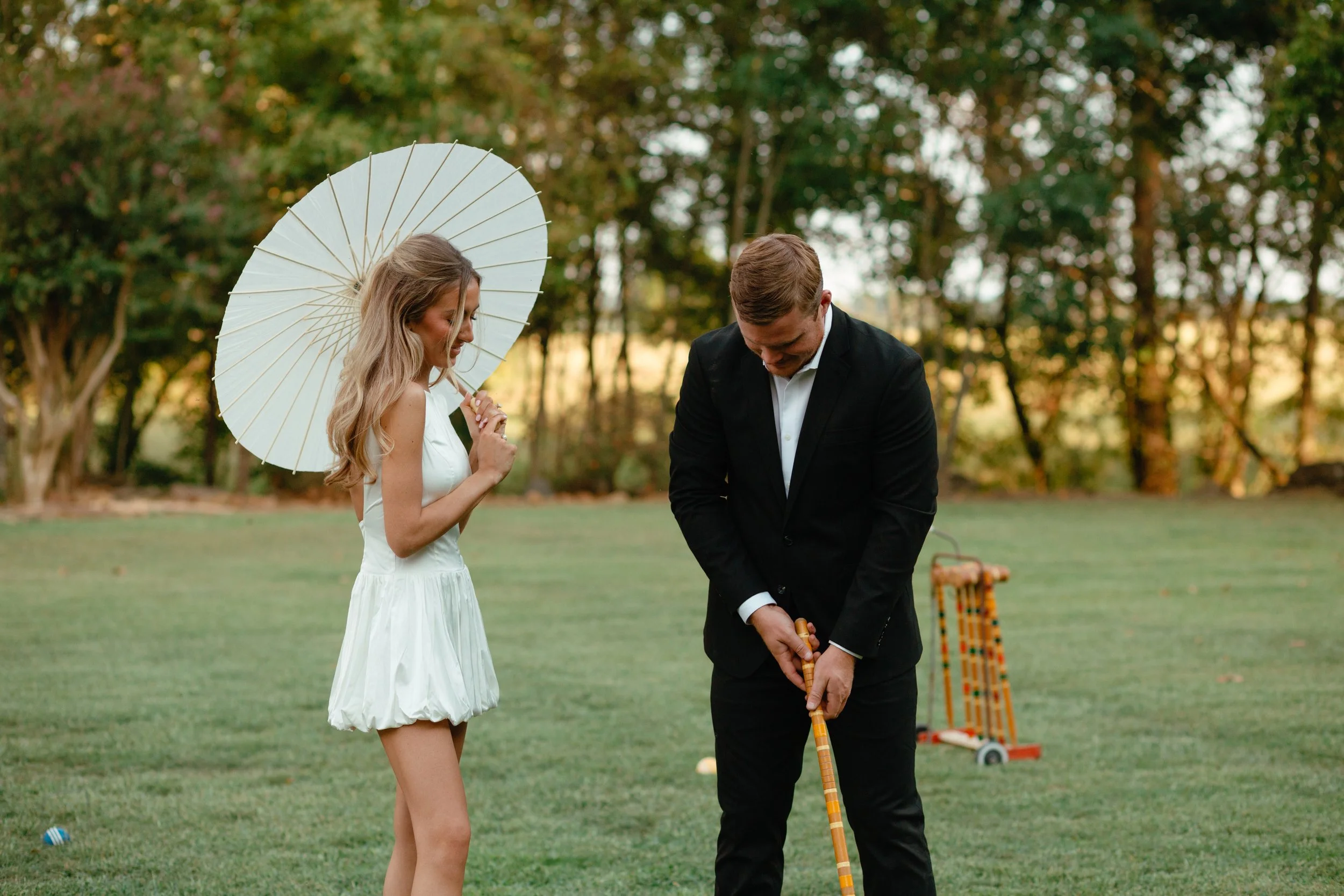 The clubhouse features white columns and arbors line the cobblestone front entrance overlooking the lush green regulation size croquet course. The stage above the croquet court begs to put you in the spotlight, with grand sycamore trees, magnolias, and crepe myrtles in white all around.