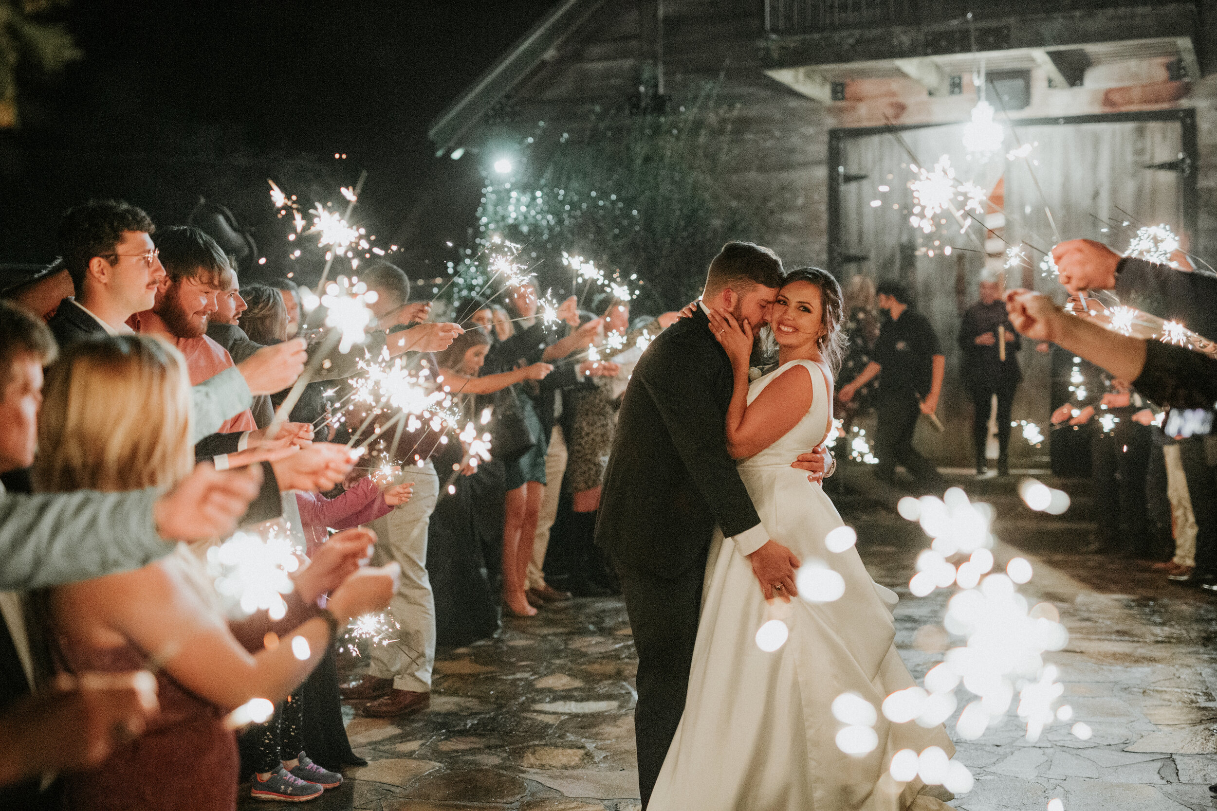 GORE CREEK IS A RUSTIC DARK WOOD BARN LOCATED IN BOAZ, ALABAMA. IT IS LOCATED ON 10 ACRES OF GORGEOUS COUNTRY PROPERTY. WHILE THE OUTSIDE IS MADE OF WOOD, THE INSIDE OFFERS A CONTEMPORARY LOOK WITH CREAM WALLS AND WOOD COLUMNS AND TONS OF WINDOWS FOR NATURAL LIGHT. INSIDE THE BARN YOU WILL ALSO FIND SHABBY CHIC BRIDE AND GROOM ROOMS AS WELL AS A FULL SERVICE KITCHEN FOR YOUR CATERER. NOT ONLY ARE THERE A TON OF OPTIONS FOR YOUR OUTDOOR CEREMONY, BUT THE BARN ALSO OFFERS A LARGE OUTDOOR PATIO ADORNED WITH CAFE LIGHTS ADDING THE PERFECT AMOUNT OF ROMANCE AND FUN FOR YOUR CELEBRATION. THE BAIRDS HAD A SIMPLE AND ELEGANT DAY WITH A CEREMONY IN THE WOODS AND THEIR RECEPTION INSIDE THE BARN ONCE THE SUN SET.