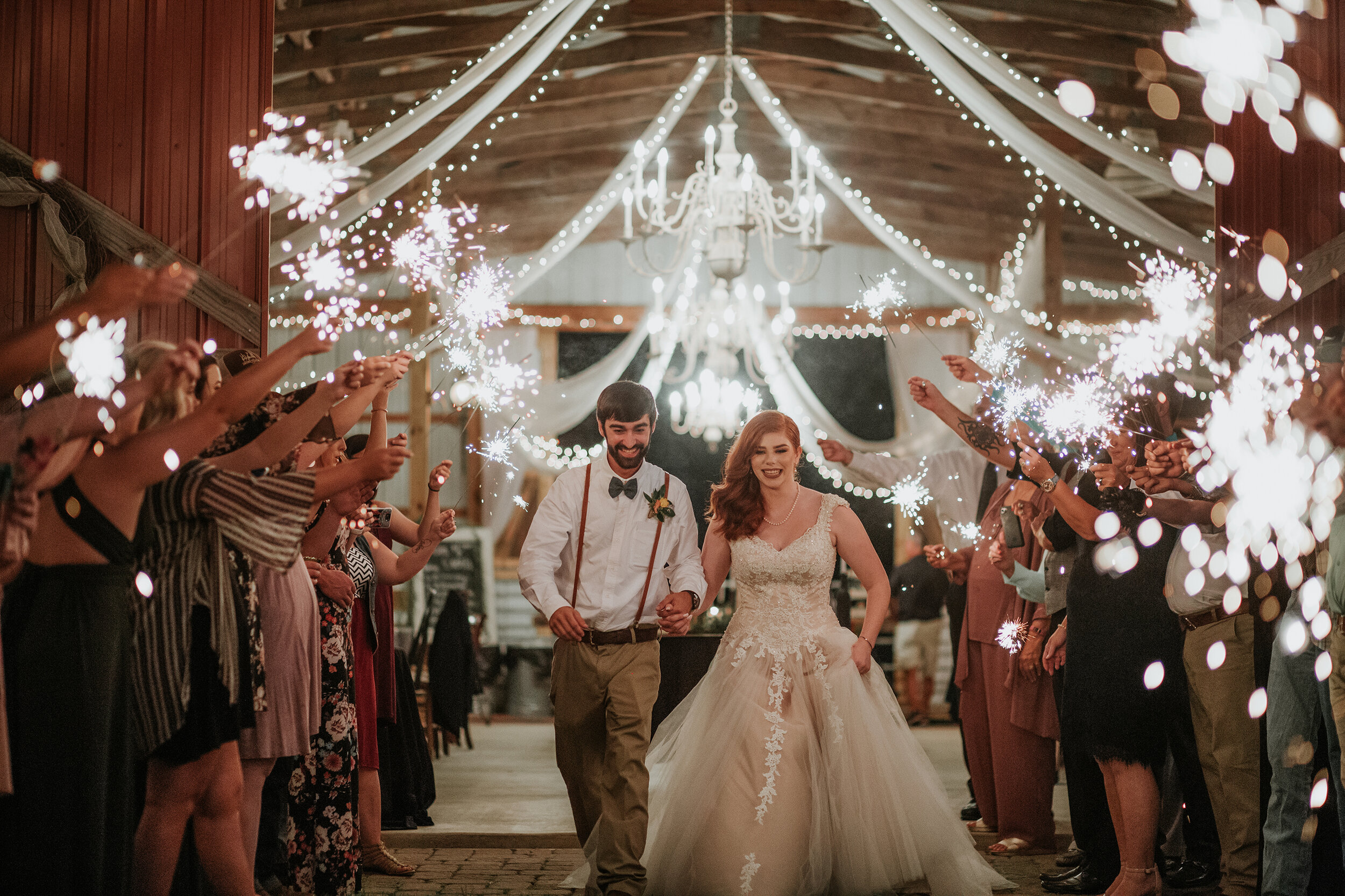 GRACEFUL OAKS IS A RUSTIC RED BARN LOCATED IN EASTABOGA, ALABAMA. THIS BARN IS SURROUNDED BY BEAUTIFUL LAND AND AN OLD RUSTIC WOODEN FENCE THAT HOLDS HORSES..WHICH MAKE FOR THE PERFECT PHOTO-OP. IF YOU’RE LOOKING FOR AN OUTDOOR CEREMONY SPACE, THEY HAVE A GORGEOUS CRYSTAL CHANDELIER HANGING IN THE TREE LINE. THIS ARE MAKES FOR A GREAT SPOT FOR A CEREMONY OR RECEPTION. THE MITCHELLS WERE MARRIED IN AN OUTDOOR CEREMONY IN THE MIDDLE OF SEPTEMBER. THEIR CEREMONY TOOK PLACE UNDER A CHANDELIER ARBOR AND THE RECEPTION FOLLOWED INSIDE THE BARN.