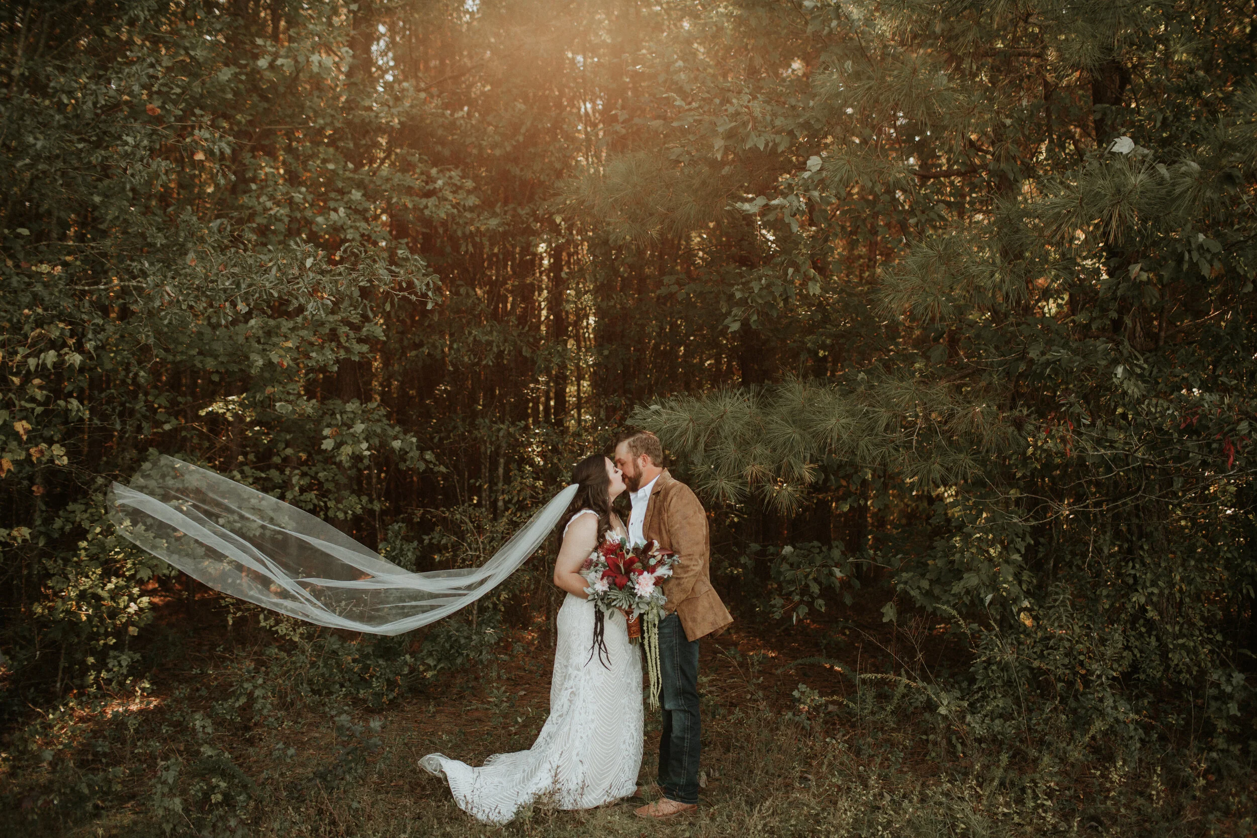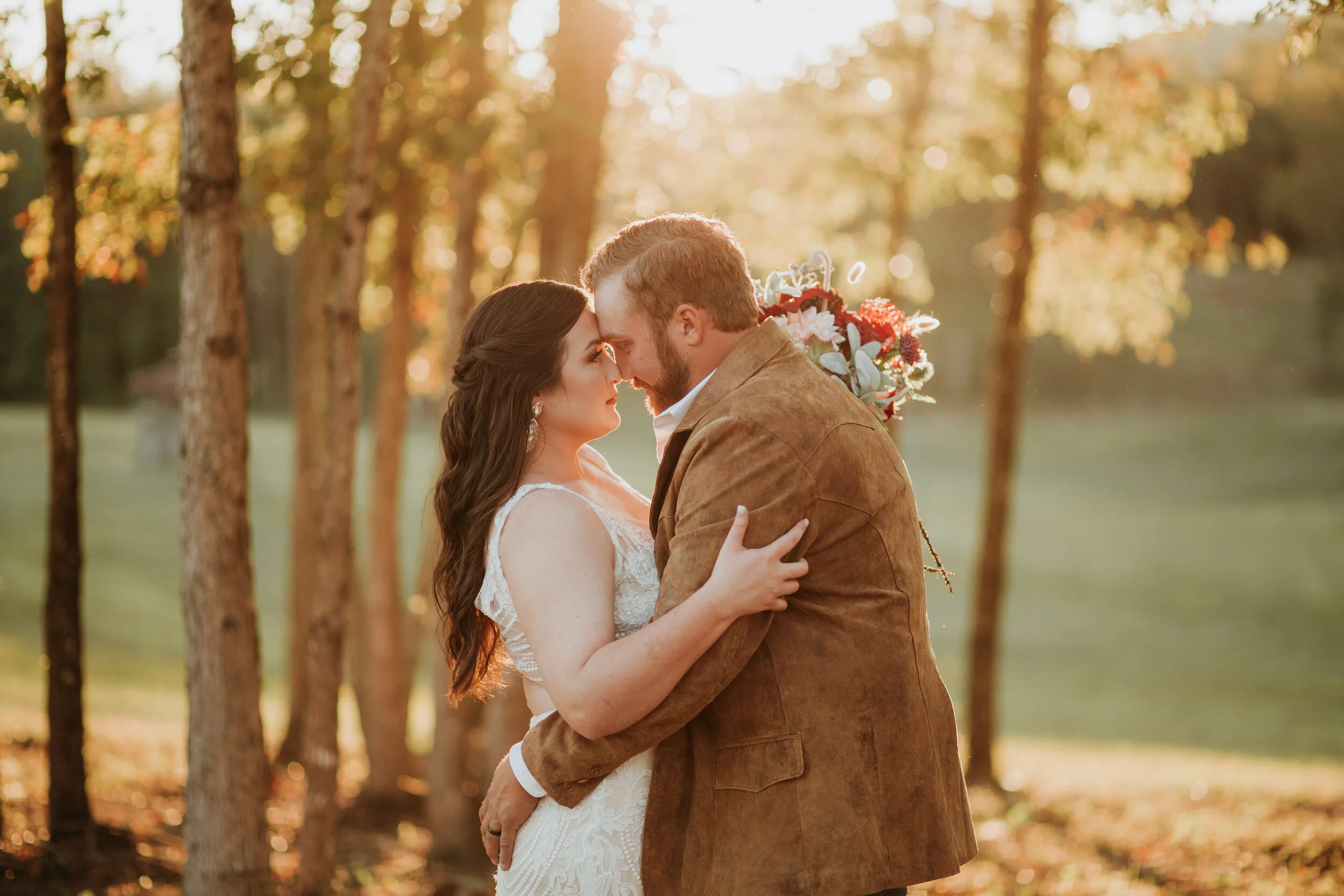 RUSTIC PINES IS A FARM NESTLED ON 15 ACRES OF PRIVATE PROPERTY IN BOAZ, ALABAMA. THIS RUSTIC BARN VENUE FOCUSES ON HIGHLIGHTING THE NATURAL BEAUTY OF THE LAND SURROUNDING IT. THERE ARE MULTIPLE GORGEOUS OUTDOOR SPOTS FOR YOUR CEREMONY, AND THEN YOU CAN MOVE YOUR RECEPTION INSIDE THE LARGE BARN THAT IS MADE TO HOST UP TO 300 GUESTS. ONE THING I LOVE ABOUT THIS VENUE, IS THEY GIVE YOU AMPLE TIME TO DECORATE AND SET UP. YOU CAN GAIN ACCESS TO THE BARN ON THE THURSDAY BEFORE YOUR WEDDING, AND THEN YOU HAVE UNTIL SUNDAY AT NOON TO HAVE EVERYTHING CLEANED UP. SO, NO RUSH AND STRESS TRYING TO GET ALL OF THE LITTLE THINGS PUT IN PLACE. YOU ALSO DO NOT HAVE TO WORRY ABOUT RENTING TABLES OR CHAIRS, AS THE VENUE COMES WITH 18 HANDCRAFTED FARM TABLES AND PLENTY OF CHAIRS. ZACH AND BRENNAN HAD A PERFECT FALL WEDDING DOWN UNDER THE PINE TREES., AND THE BARN WITH ITS BEAUTIFUL CHANDELIER WAS THE PERFECT PLACE TO DANCE THE NIGHT AWAY!