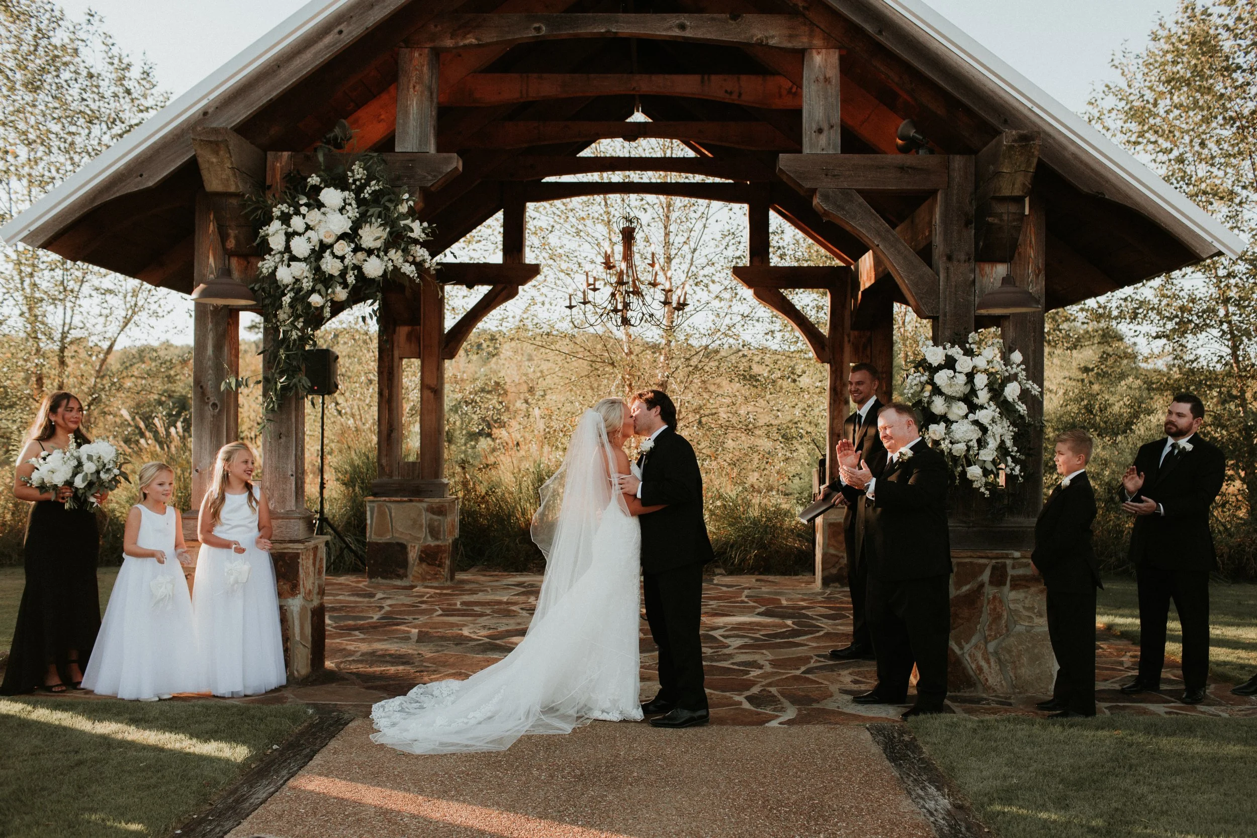 DRY CREEK IS A GORGEOUS WOODEN CHAPEL AND BARN LOCATED ON 15 ACRES IN LEESBURG, ALABAMA. THIS VENUE GETS ITS NAME FROM THE DRY CREEK THAT RUNS THROUGH THE PROPERTY. THE OPEN AIR CHAPEL IS A GORGEOUS LOCATION FOR YOU TO SAY “I DO”, EVEN ON RAINY DAYS, AND SEATS BETWEEN 200-250 GUESTS. THE RECEPTION BARN IS THE PERFECT PLACE TO DANCE THE NIGHT AWAY. IT IS HEATED AND COOLED AND COMBINES A LITTLE INDUSTRIAL FEEL WITH THE FARMHOUSE LOOK TO CREATE A WELCOMING ENVIRONMENT FOR YOUR GUESTS AND A GORGEOUS BACKDROP FOR YOUR DAY. UPSTAIRS YOU WILL FIND THE GROOM’S ROOM COMPLETE WITH A POOL TABLE. THERE IS ALSO A SEPARATE BRIDAL CABIN WITH ALL WHITE SHIPLAP. IT IS SERIOUSLY A GORGEOUS PLACE TO PREPARE FOR YOUR WEDDING DAY. THE MONTROYS HAD SOME RAIN ON THEIR WEDDING DAY AND DECIDED TO HOLD EVERYTHING INSIDE, BUT IT COULDN’T HAVE BEEN MORE BEAUTIFUL. THE BACK OF THE BARN ALSO HOSTS A GORGEOUS BACK PORCH THAT IS PERFECT TO STILL ACHIEVE THAT OPEN AIR FEEL.