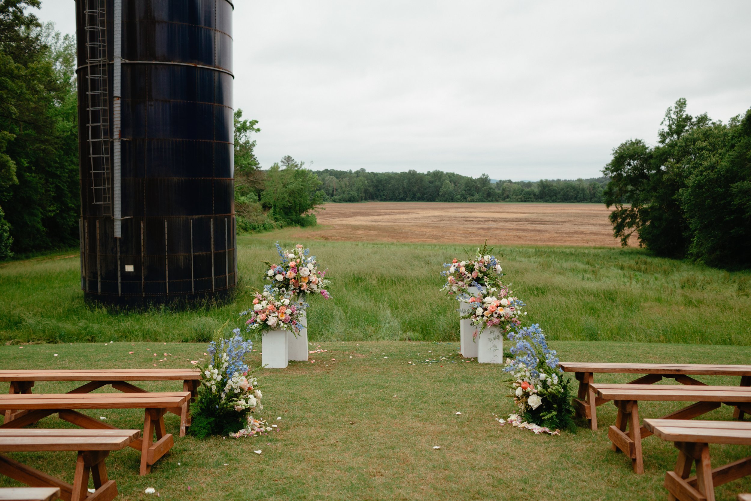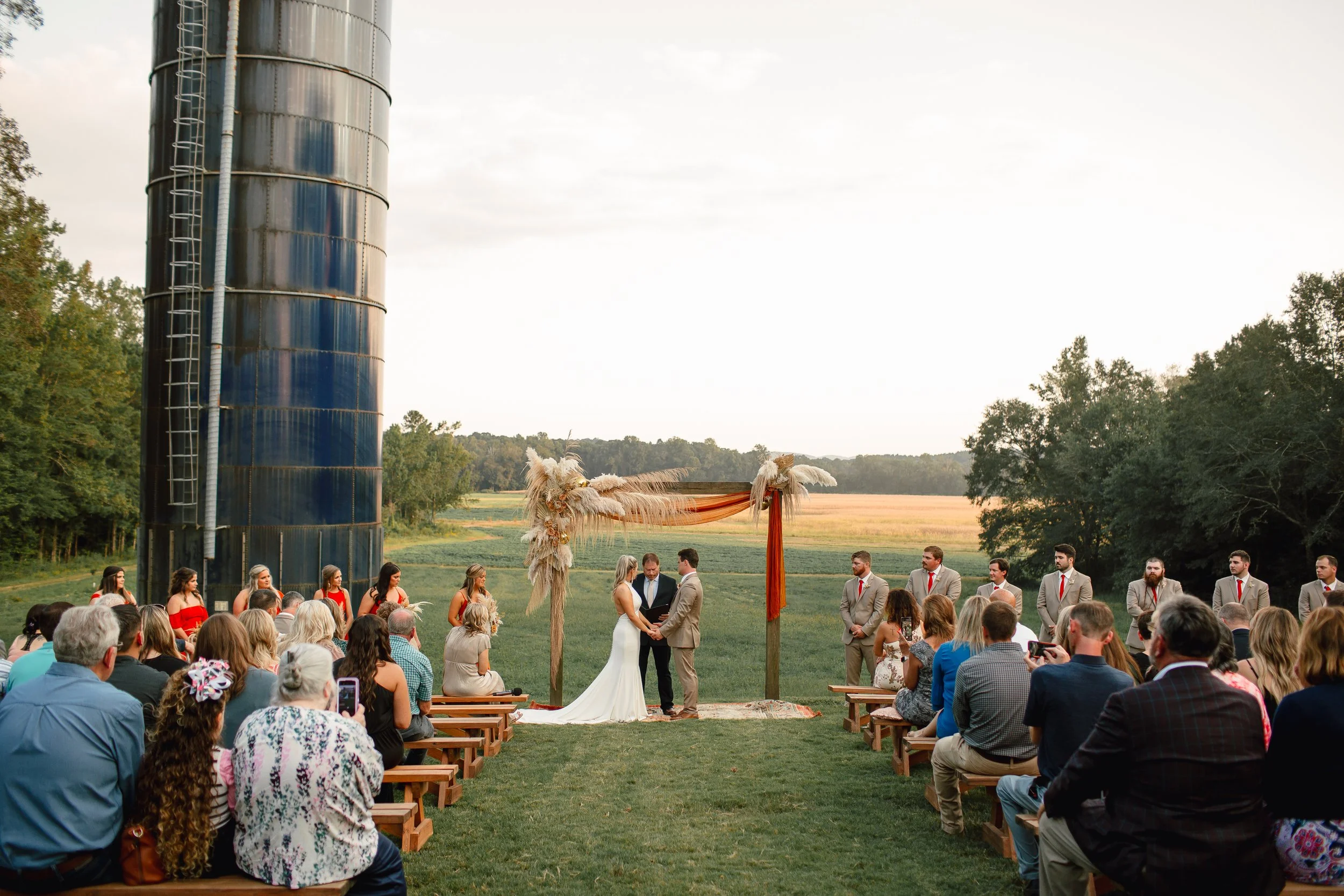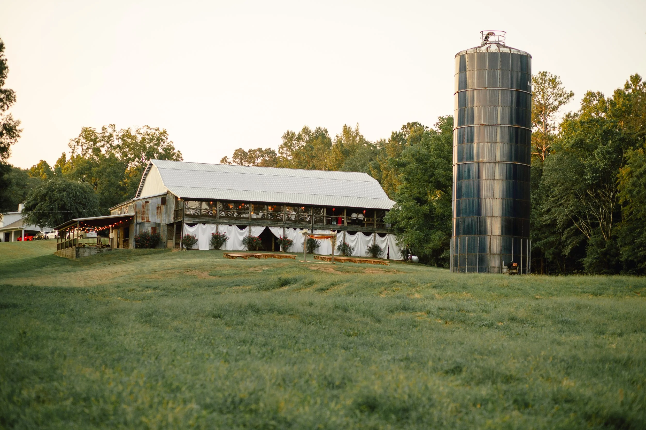 The Barn at Bennett Flats property boasts a beautiful age-old 12,000 square foot barn overlooking 300 acres of scenic river bottom that borders the Tallapoosa River. The Barn has been in the Bennett/Miles families for over 70 years. With its rich history, amazing views, and gorgeous original barn wood, this is a venue that makes a lasting impression. Looking for an open, rustic feel without the heat and cold? This barn wedding venue has central heating and AC! It can easily accommodate indoor or outdoor wedding ceremonies, receptions, Christmas parties, reunions, showers, birthday parties, proms, formals, etc. for as many as 400 guests. They have a prep area for caterers to use, as well as our own tables, chairs, linens, arbor, 15 foot farm table, water troughs, and Bluetooth surround sound speaker system.